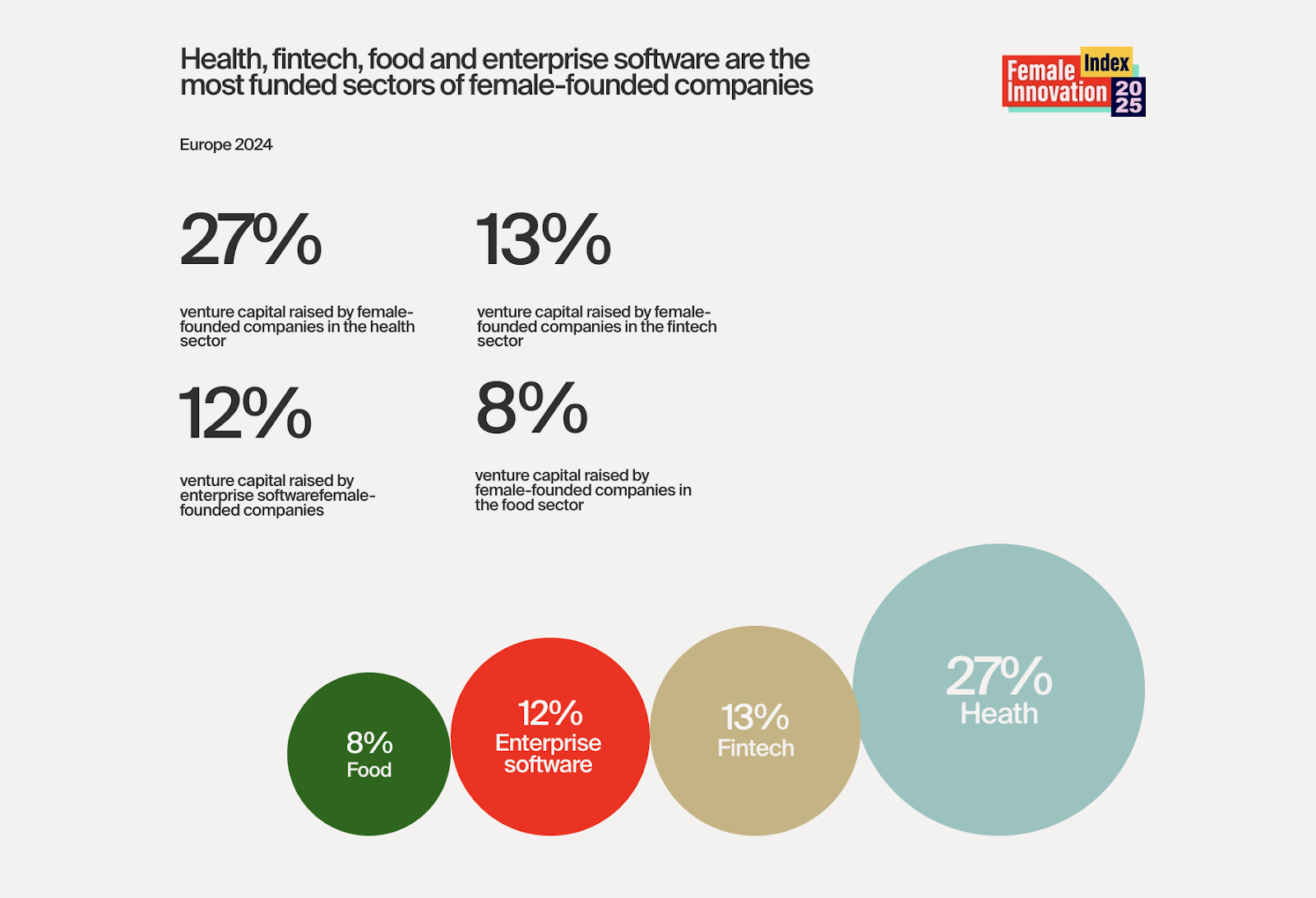 In the broader market, female-founded B2B companies dominate venture capital investment: 71% goes to B2B, 21% to B2C, and 8% to B2B2C companies. The most funded sectors are health (27%), fintech (13%), enterprise software (12%), and food (8%).