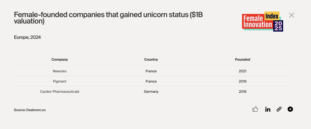 Three new female-founded companies achieved unicorn status in 2024, marking a 14% increase from last year (21 to 24), with France leading this growth. Notable examples include Newcleo (€135M raised at €1.5B valuation), Pigment ($145M at $1B valuation), and Cardior Pharmaceuticals (acquired by Novo Nordisk for $1B).