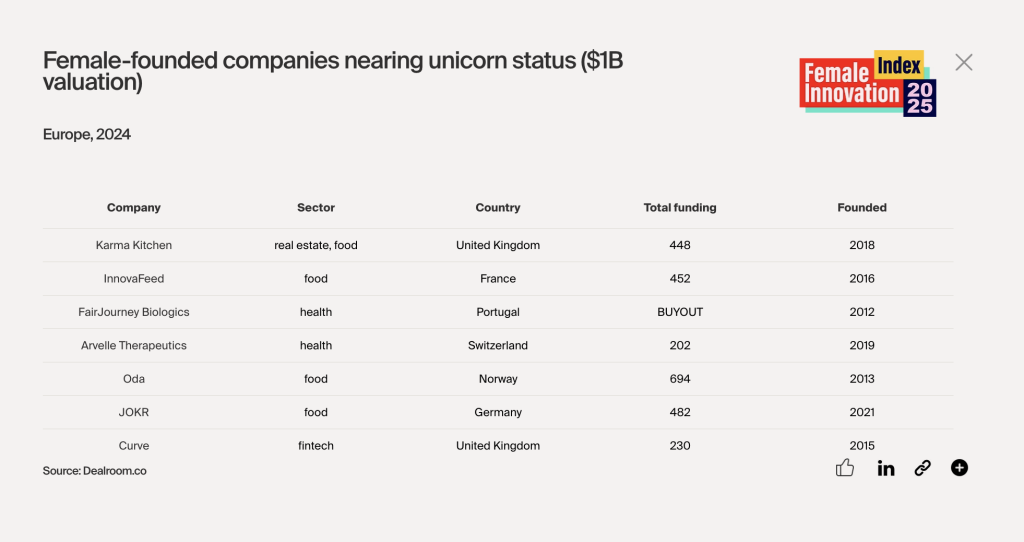 The report indicates a 40% increase in European female-founded companies approaching unicorn status (from 10 to 14), with valuations nearing $1B. These emerging leaders span real estate, food, health, fintech, space, energy, and enterprise software industries, primarily in the UK, Germany, and France.